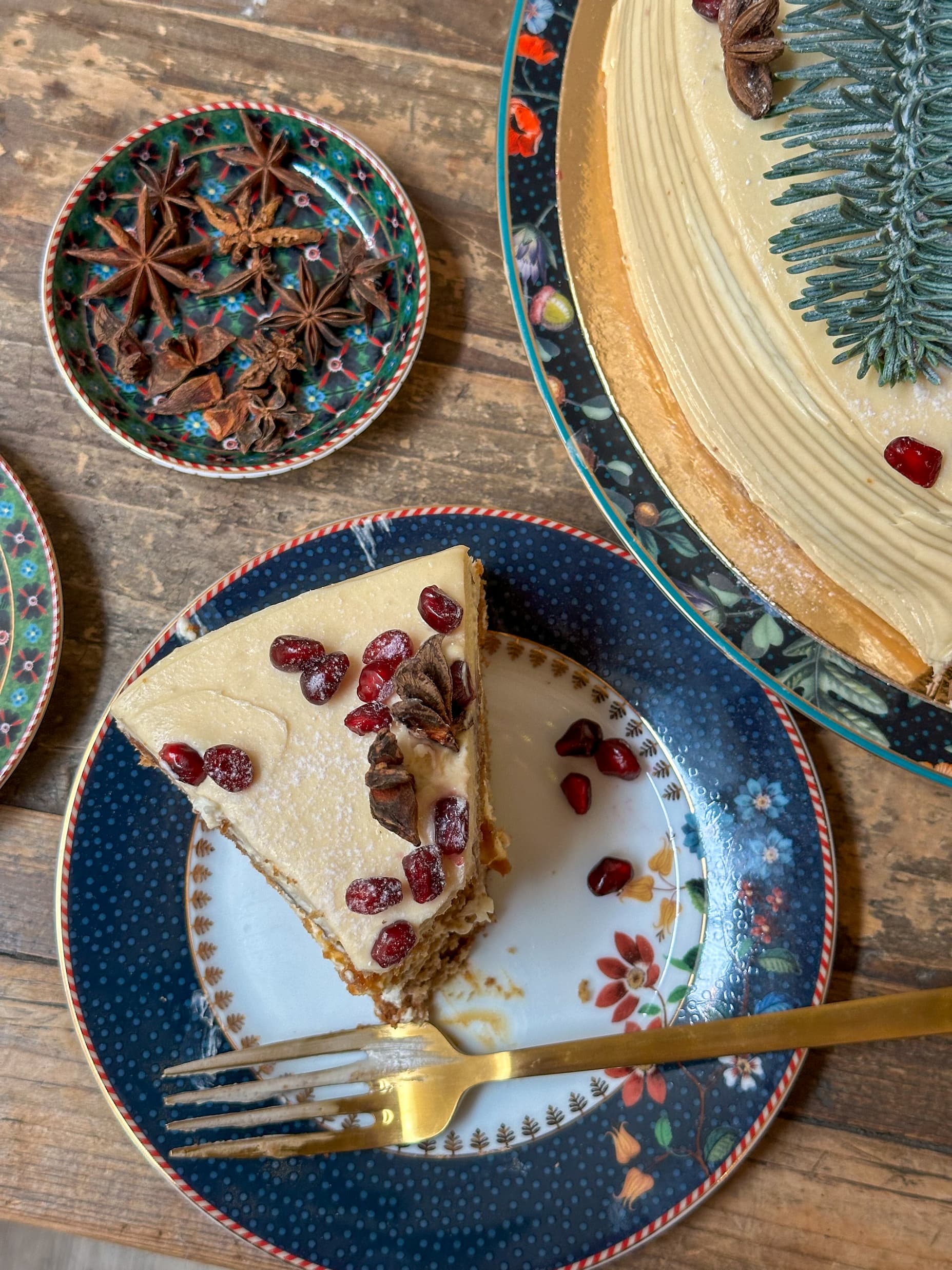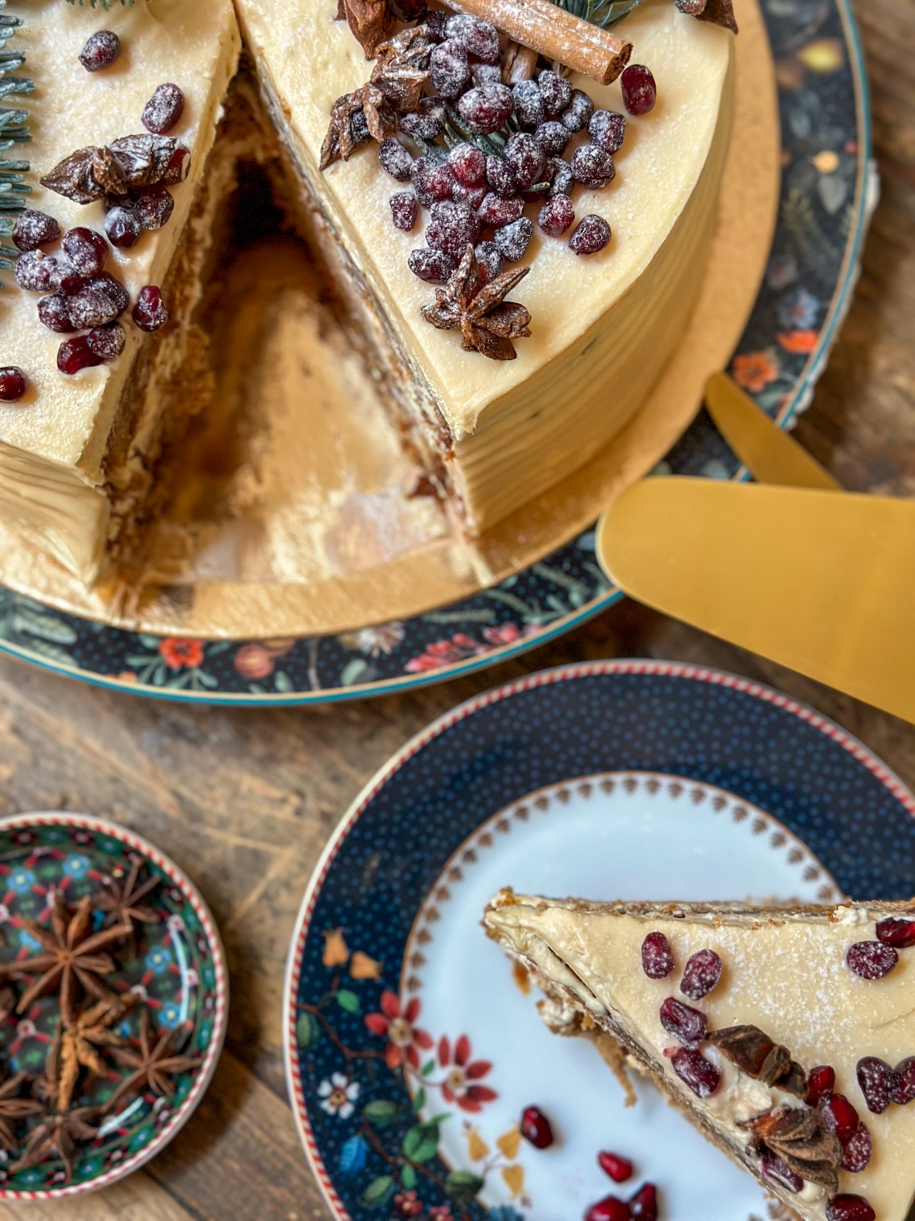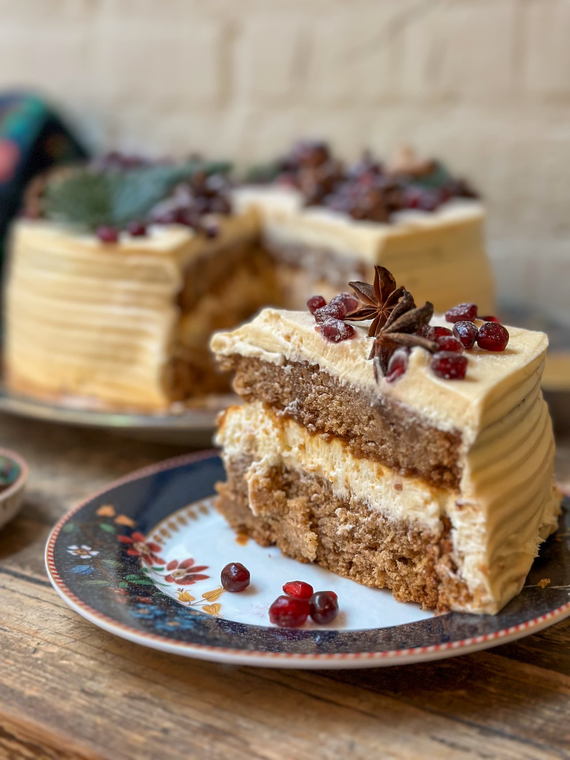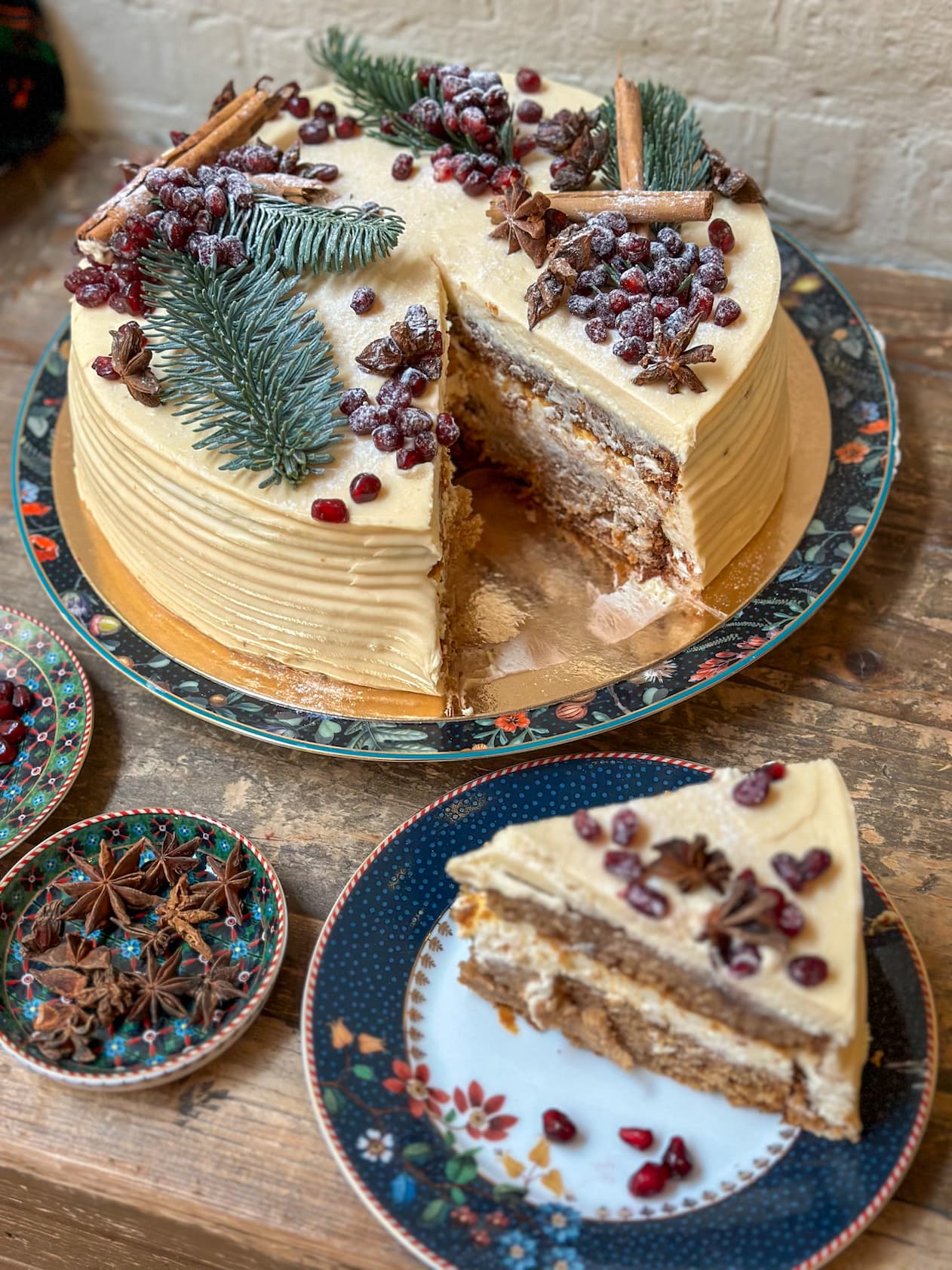 Os presentamos nuestra Tarta Navideña. Un bizcocho especiado con jengibre y canela relleno de dulce de leche y cubierto de buttercream. Una creación pensada para envolver cada momento en sabor, tradición y magia