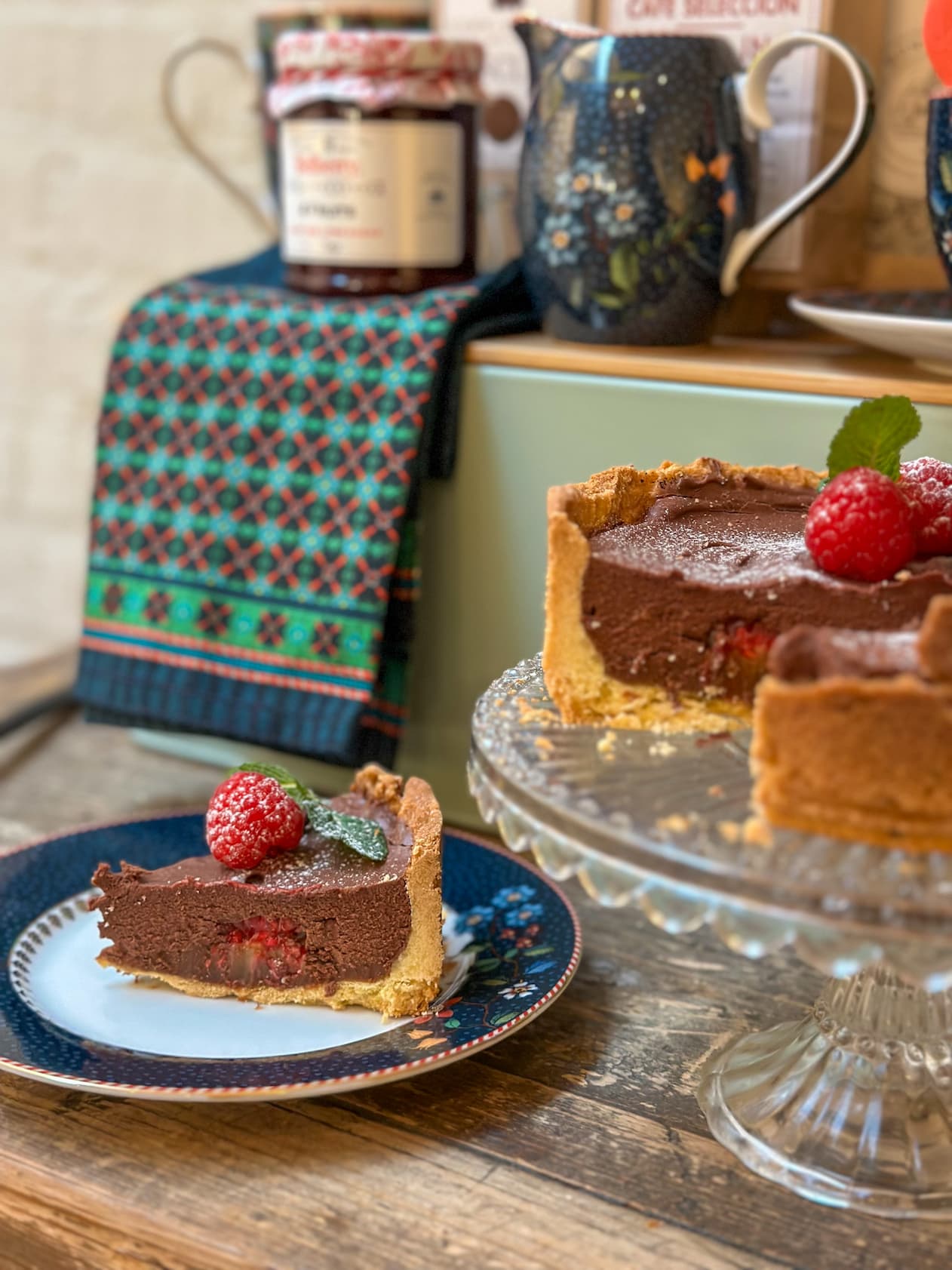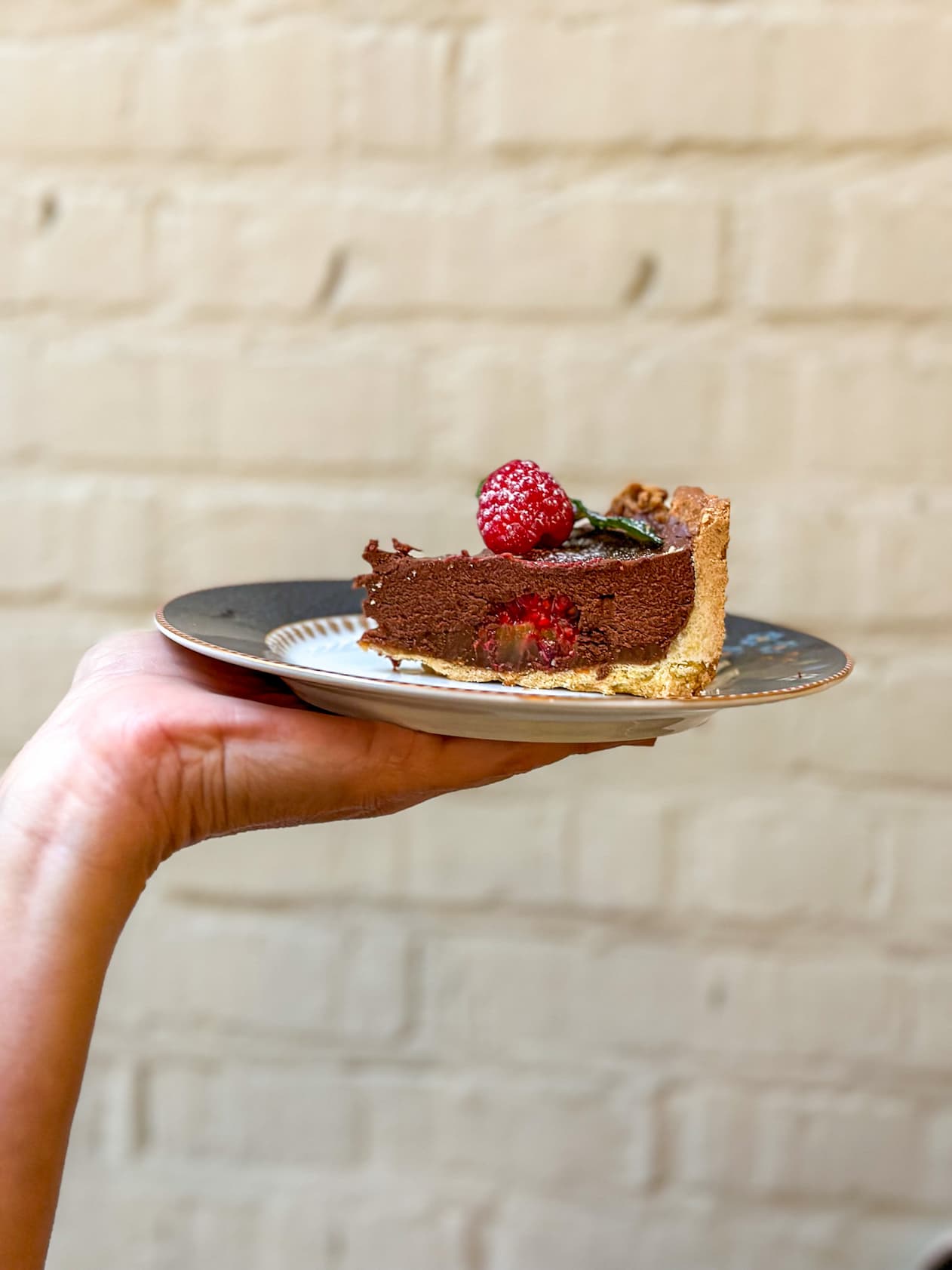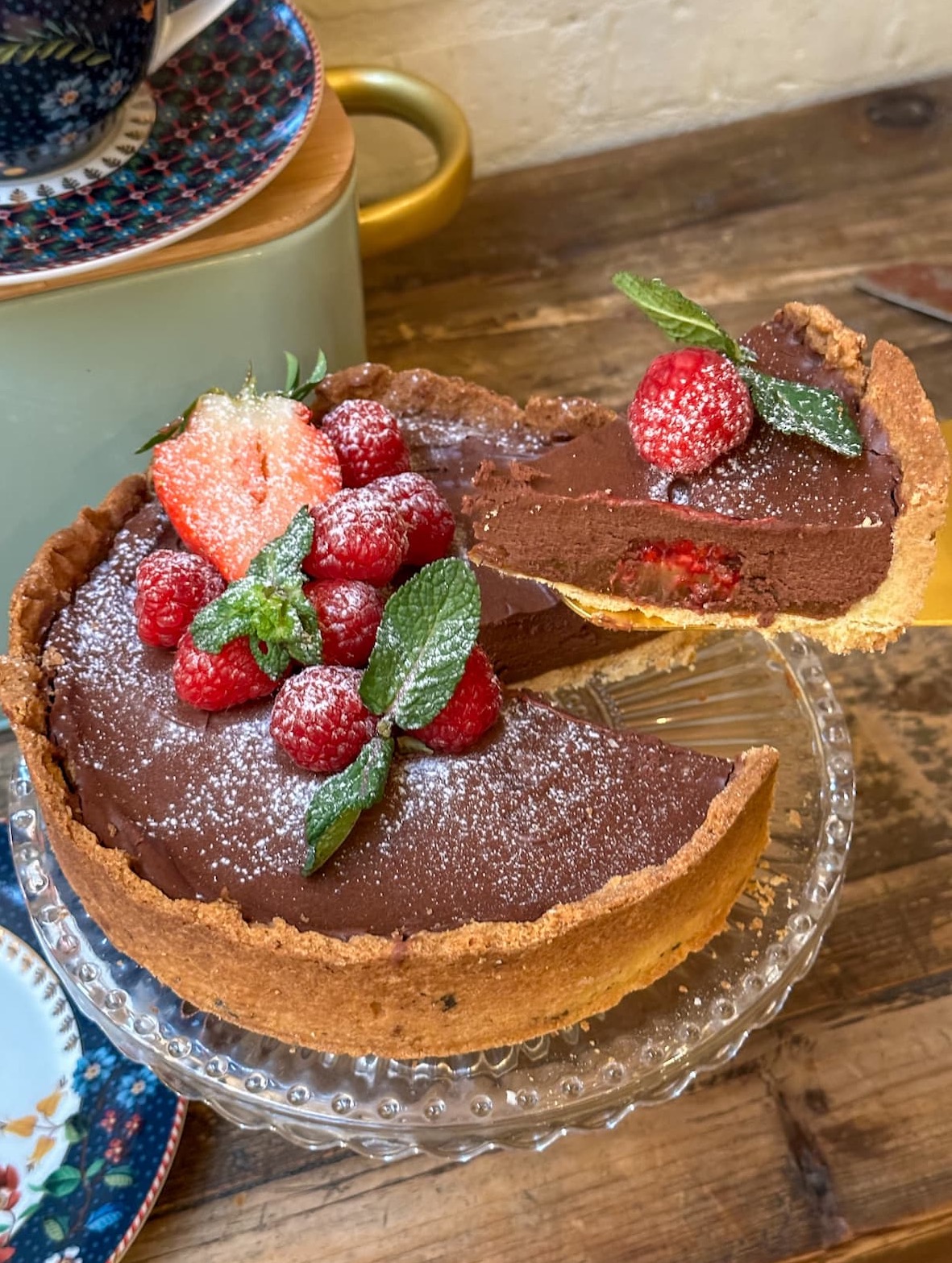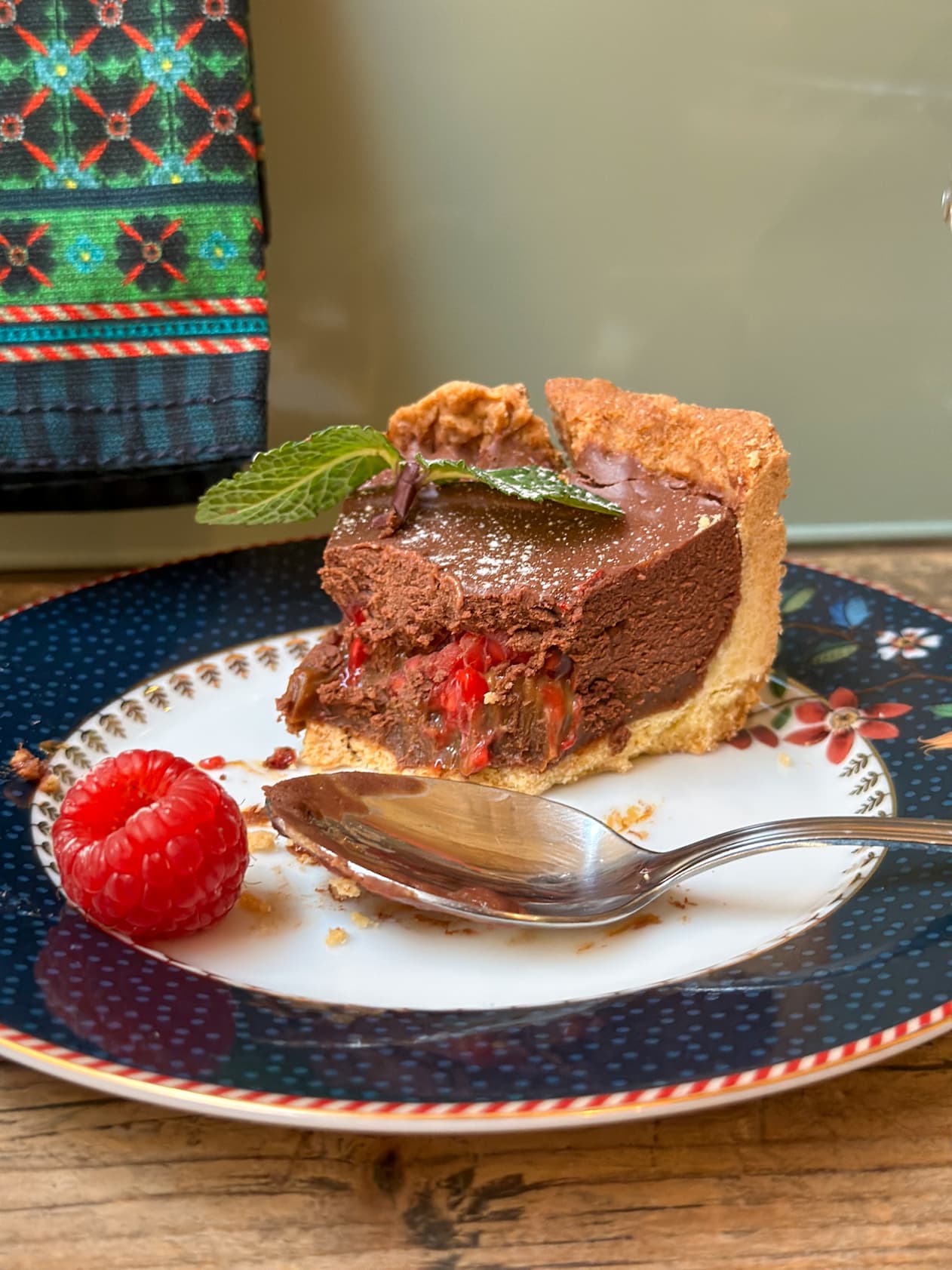 Base crumble crujiente, una fina capa de dulce de leche, fondo de frambuesas y un relleno de mousse de chocolate. Decorada con frutos rojos frescos y un toque de menta