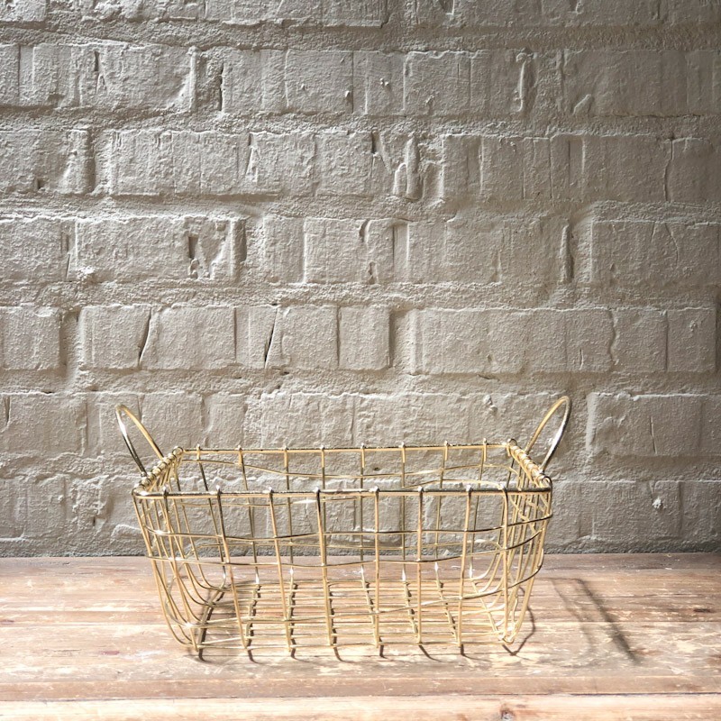 Cesta cuadrada metálica dorada o color bronce según existencias, con dos asas, para almacenar lo que necesites. Es ideal para utilizar como base para presentar un regalo personalizado Pandelino, un desayuno, merienda o producto gourmet.