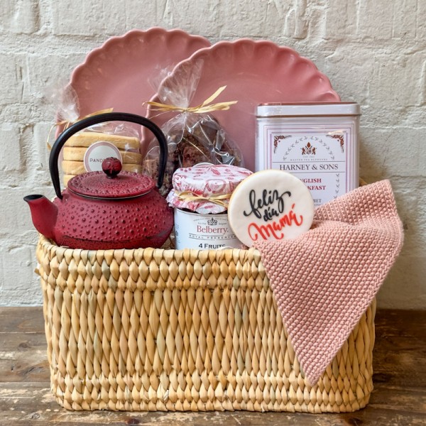 La cesta Mamá rosa es el regalo perfecto para el Día de la Madre porque el rosa es su color. Incluye dos platos Mynte coral, una tetera de hierro fundido roja, un paño pequeño tejido rosa, té English Breakfast de Harney & Sons, mermelada cuatro frutas de Belberry, brownie, galletas de mantequilla Pandelino y una galleta decorada especialmente para celebrar el Día de la Madre. Todo ello presentado en un cesto de junco.
