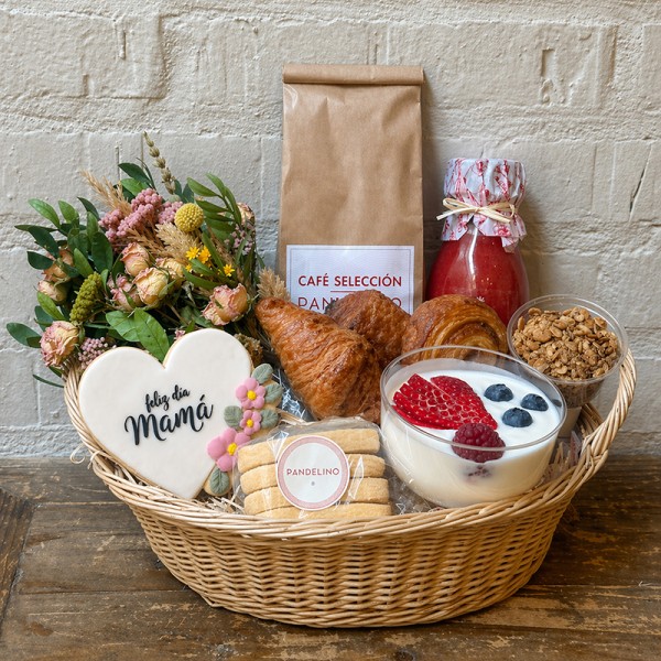 Un Café para Mamá con Amor el Día de la Madre para demostrarle tu cariño. Esta cesta de desayuno incluye aceite de oliva virgen extra pandelino, rebanada de pan para tostadas, café selección 100% arábica Pandelino, un mini croissant, una mini caracola de canela, una mini napolitana de chocolate, zumo de fresa naranja y limón, yogur ecológico con frutos rojos, granola casera, una bolsa de galletas de mantequilla en forma de corazón, una galleta de mantequilla decorada especialmente para celebrar el Día de la Madre y un ramillete de flor preservada. Todo ello presentado en una cesta ovalada de mimbre.