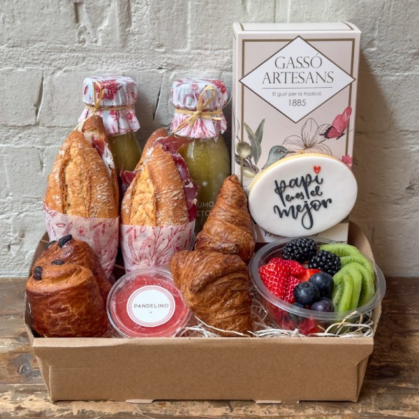 Celebra el Día del Padre con nuestro Desayuno Papi eres el mejor. Incluye dos zumos Detox, dos pulgas de jamón ibérico, tomate rallado naturales, dos mini croissants, dos mini napolitanas de chocolate, un bowl de fruta de temporada, palmeras Gassó Artesans y una galleta decorada especialmente para el Día del Padre.