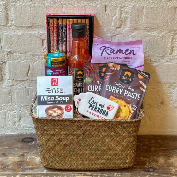 Nuestra cesta Chinito de AmoL para los que disfrutan de la gastronomía oriental. Incluye unos palillos chinos, ramen de arroz negro Terrasana, curry rojo picante y curry amarillo de Siam, pasta de curry verde tailandés Terrasana, salsa Thai chile dulce de Siam, sopa miso Enso y una galleta de mantequilla decorada especialmente para San Valentín. Todo ello presentado en una panera rectangular.