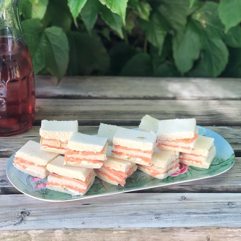Finger Sandwich Salmón con crema de queso al eneldo. Clásicos sandwiches Pandelino de pan tramezzini, cortados en cuadrados, con relleno de salmón con crema de queso al eneldo. Una deliciosa opción para disfrutar de picnic, en una comida campestre, en tu propia casa de picoteo o para disfrutar en un brunch.