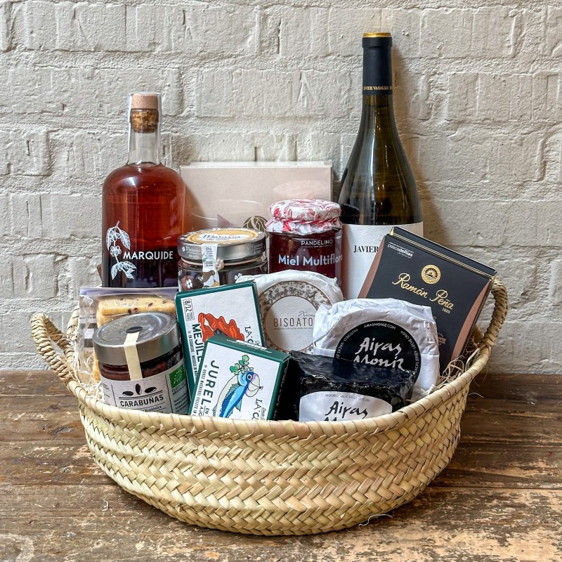La Cesta da Nosa Terra incluye vino Ribeiro Javier Vasallo, queso Bisqato, queso Savel Terra, queso Savel Xiros, mermelada de sabugueiro Carabuñas, Conservas La Curiosa miel multifloral Pandelino, Maruxas de nata, Pitucas de arándanos, licor Marquide y las galletas Nosas Diversas Raizame. Todo ello presentado en una cesta de palma.