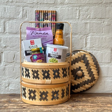 Nuestra Cesta exótica incluye cacahuetes con wasabi Enso, sopa miso Enso, ramen de arroz negro Terrasana, pasta de curry verde tailandés Terrasana, salsa Thai peanut coconut de Siam y un pack de palillos chinos. Cesta Gourmet presentada en una cesta vaporera Nian de seagrass.