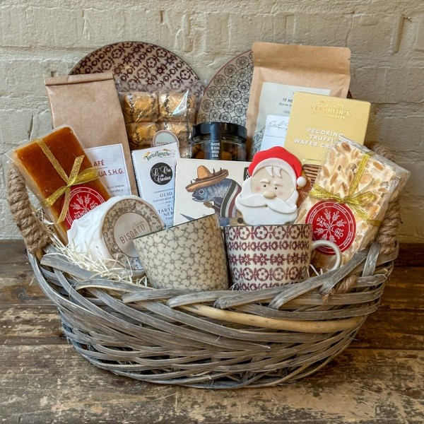 Nuestra Cesta navideña Karine incluye dos tazas y dos platos Karine, café selección y té negro Earl Grey Pandelino, turrón de yema, turrón de Alicante y pasteles de yema Pandelino, aceite de trufa negra Tartuflanghe, crackers pecorino y trufa Verduijn´s, queso Bisqato de Xiros, xoubiñas en salsa de chilote adobado Ar de Arte, aceitunas de Kalamata en AOVE Kalios y una galleta navideña decorada especialmente para estas fiestas. Todo ello presentado en una gran cesta oval de mimbre gris.