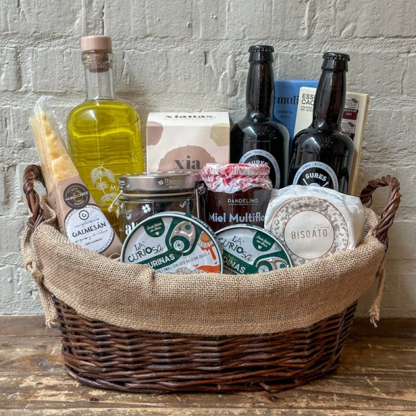 La Cesta Terra Galega incluye dos cervezas Gures, licor de hierbas Marquide, queso Bisqato, miel Pandelino, dos conservas La Curiosa, queso Galmesán, dos tabletas de chocolate Essenzo Cacao, Maruxas de nata con chocolate y galletas Xianas, todo productos gourmet gallegos. Cesta Gourmet presentada en una cesta ovalada con dos asas.