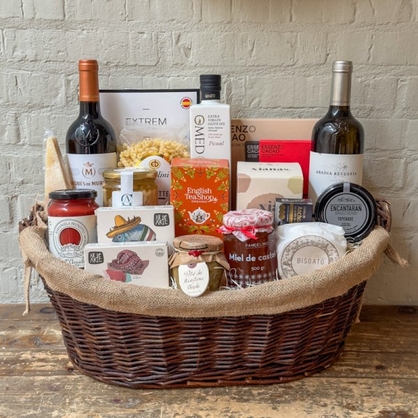 Nuestra Gran Cesta Gourmet es un gran regalo para celebrar y compartir. Incluye vino Marqués de Murrieta, lomo de bellota EXTREM, riccette Bartilini, lomos de bonito Ana María, salsa arrabbiata Mariangela Prunotto, cuña de queso galmesán, aceite de oliva extra virgen picual O-med, xoubiñas en salsa de chipotle y paté de pulpo a feria Ar de Arte, paté de aceituna verde La Cuna, té black chai English Tea Shop, miel de castaño Pandelino, galletas Xianas de almendra, dos tabletas de chocolate Perla y Akesson y rocas de chocolate Essenzo cacao, vino blanco Abadía de Retuerta Le Domaine 2021, queso Bisqato de Xiros, anchoas en aceite oliva Catalina y tapenade Encantaran. Todo ello presentado en un cesto ovalado forrado.