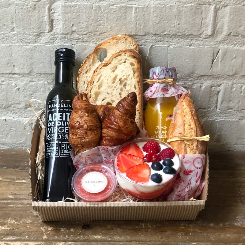 Una deliciosa cesta desayuno para empezar bien el día que incluye un zumo natural de naranja, un bol de yogur ecológico con frutos rojos, un mini croissant, un mini croissant de cereales, una mini napolitana de chocolate, una pulga de jamón ibérico, unas rebanadas de pan fresco, tomate rallado y un aceite de oliva virgen extra ecológico Pandelino 250 ml. Todo ello envuelto en un bonito paquete regalo.