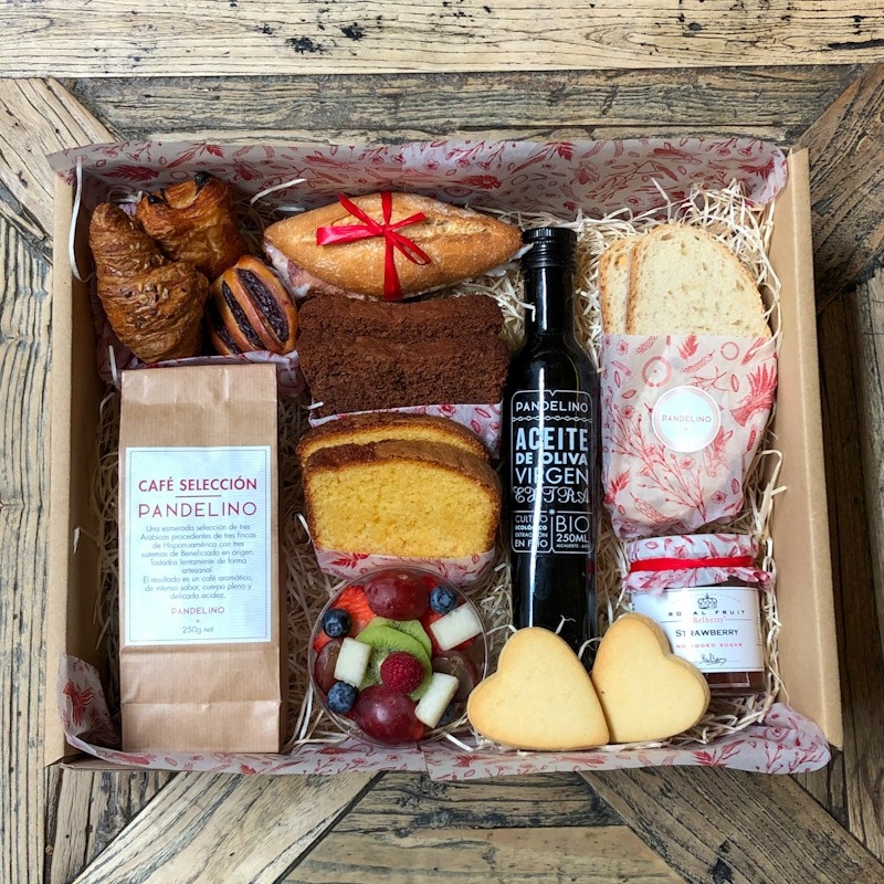 Un completo desayuno para empezar el día con energía. Esta caja incluye una porción de bizcocho de yogurt, porción de bizcocho de chocolate, rebanadas de pan fresco, bowl de fruta de temporada, mini croissant, mini croissant de cereales, mini napolitana, café selección Pandelino, una pulga de jamón ibérico, dos galletas de mantequilla, aceite OVE ecológico Pandelino y mermelada.