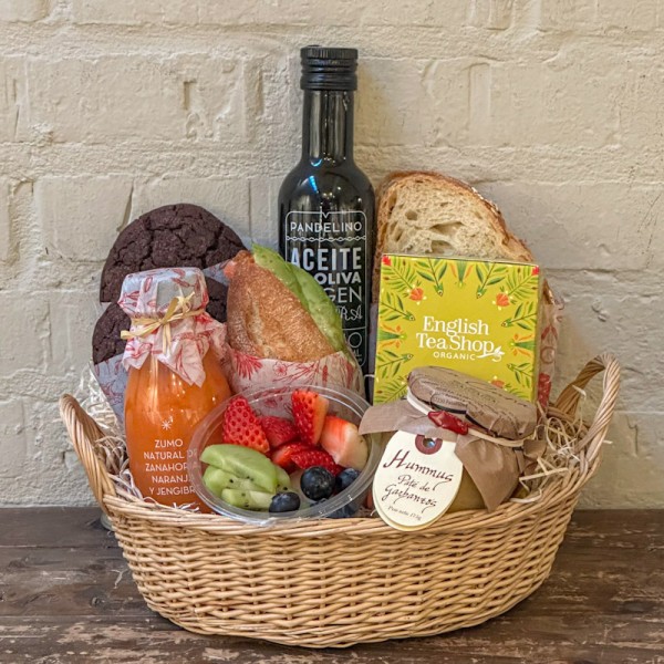 Nuestro Desayuno Vegano Pandelino a domicilio incluye Aceite de oliva virgen extra Pandelino, Té Lemongrass, Ginger & Citrus English Tea Shop, zumo de zanahoria, naranja y jengibre natural, dos cookies veganas Pandelino, una pulga de aguacate con tomate, dos rebanadas de pan blanco, Hummus La Cuna y un bol de frutas de temporada. Todo ello presentado en una bandeja ovalada de mimbre.