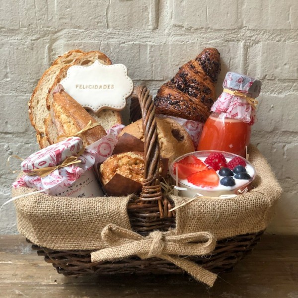 Feliz en tu día es una cesta desayuno para felicitar a alguien especial en su día. Contiene zumo de frutas naturales de fresa, naranja y limón, yogur eco con frutos rojos y granola casera, mermelada de fresa Belberry, dos rebanadas de pan fresco, pulga de jamón ibérico, muffin de arándanos, croissant de chocolate, cookie Pandelino y una galleta de mantequilla Pandelino decorada Felicidades. Todo ello presentado en una pequeña cesta de mimbre con un asa y forro de tela de saco.