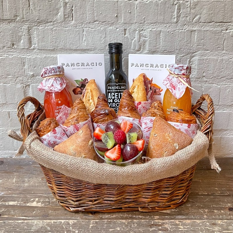 Mil gracias es una cesta desayuno Pandelino, una manera deliciosa de dar las gracias. Esta cesta contiene dos zumos de frutas naturales, uno de fresa , naranja y limón y otro de naranja, zanahoria y jengibre, un bowl de frutas de temporada, dos pulgas de jamón ibérico, dos panecillos de olivas verdes, un aceite de oliva Pandelino 250 ml, dos mini napolitanas de chocolate, dos mini croissant, dos mini croissant de cereales y dos tabletas de chocolate Somontano Coll. Todo ello presentado en una cesta ovalada de mimbre con dos asas y forro de tela de saco.