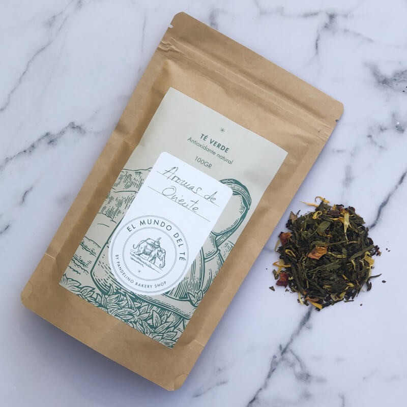 Té verde Aromas de Oriente Pandelino, té verde China Sencha, citronela, té blanco Mao Feng, pétalos de rosa, arándano y hojas de bambú.
