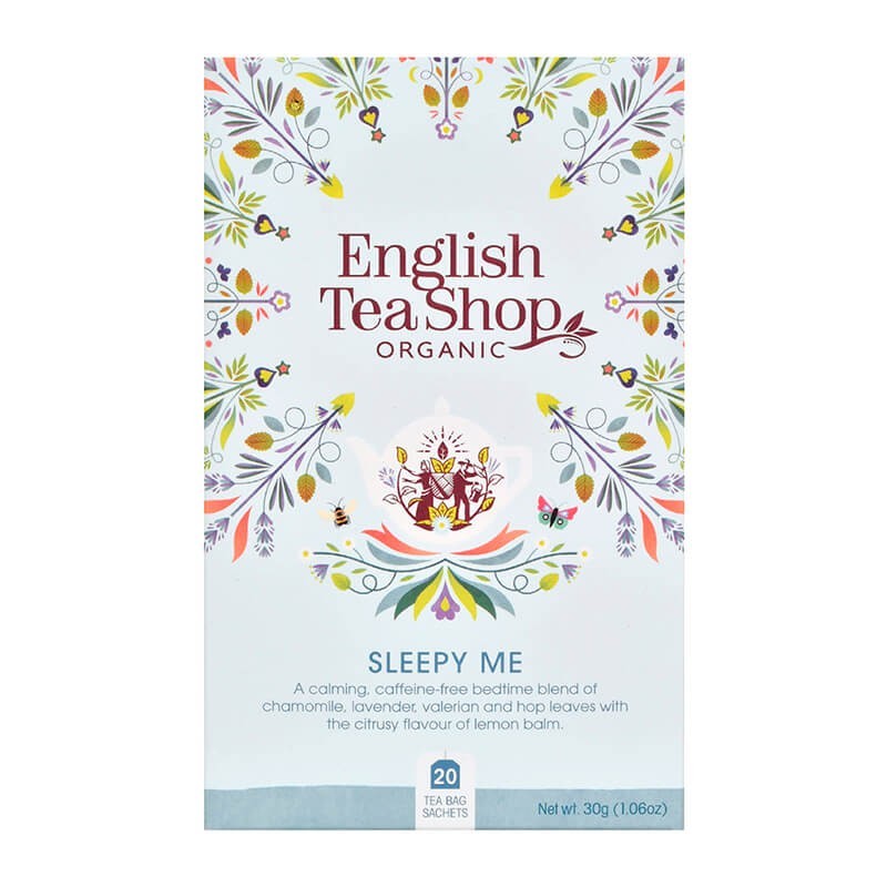 Sleepy Me tea English Tea Shop, mezcla sin cafeína de manzanilla, lavanda, valeriana, lúpulo y bálsamo de limón, ideal para relajarse antes de dormir. Ecológico.