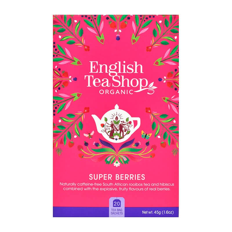 Té Super Berries English Tea Shop, té de hierbas de hibisco orgánico con rooibos, fresas, arándanos y frambuesas.