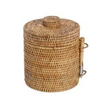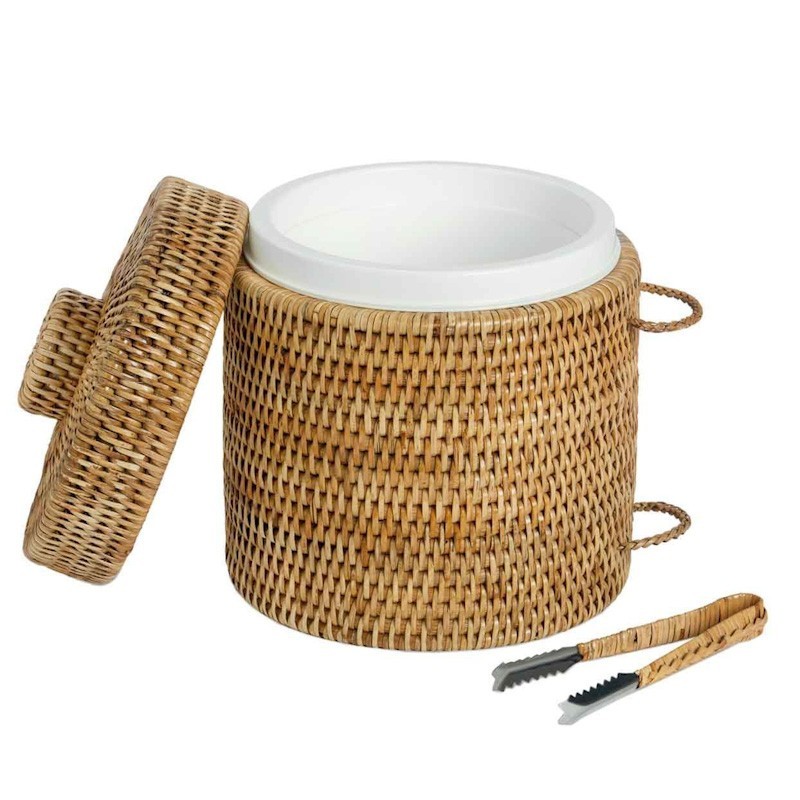 Cubitera de rattan con pinzas, ideal para colocar los cubitos de hielo y mantenerlos durante horas. Incorpora unas pinzas de metal y un soporte para sujetarlas. La tapa permite conservar mejor la temperatura fría en el interior que es de plástico para poder vaciarlo y limpiarlo cómodamente y sin dañar la fibra natural del rattan.