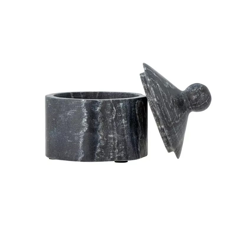 La Caja mármol negro Inette es un tarro con tapa de mármol negro con vetas blancas y grises. Ideal para almacenar pequeños objetos o como elegante pieza decorativa.