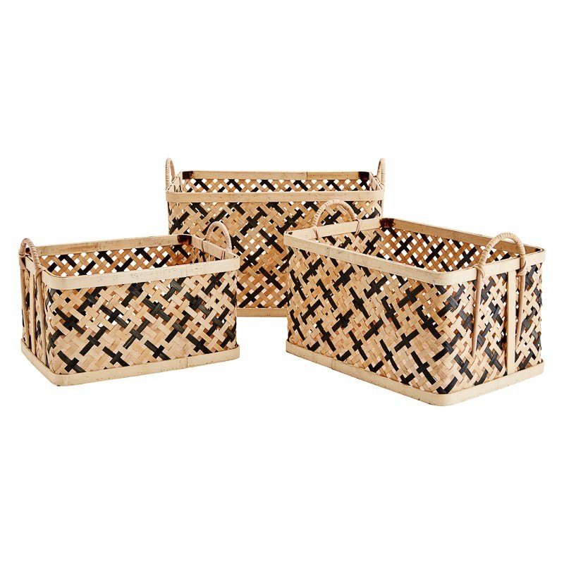 Set de 3 Cestas rectangulares de bambú natural y negro, caladas y con 3 tamaños diferentes. Cestas muy decorativas que darán a tu casa un aire natural y fresco. Disponible por separado.
