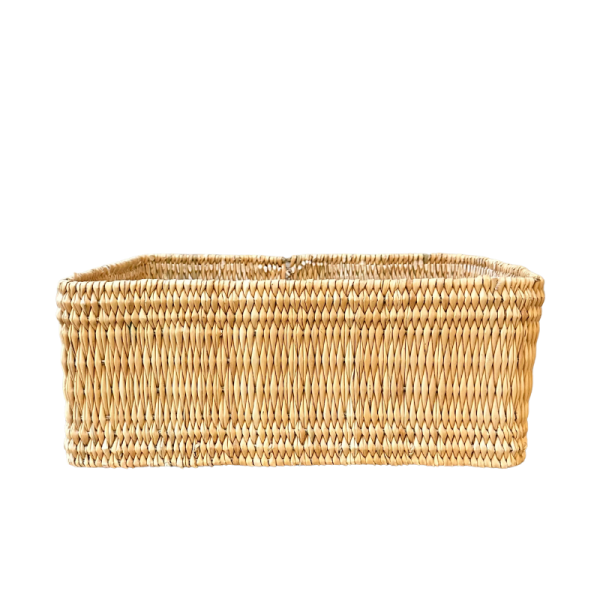 Cesto de Junco L, de forma rectangular y grande, de junco claro, amplio y robusto, ideal para crear cestas de desayuno completas o regalos gourmet con presencia. También funciona como práctico cesto de almacenaje para textiles, juguetes o revistas.
