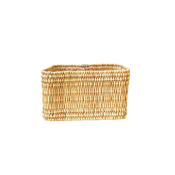 Cesto de Junco S, pequeño cesto rectangular de junco claro, ligero y resistente, perfecto como base para desayunos o detalles gourmet. También es ideal para organizar accesorios pequeños en casa con un toque natural y decorativo.