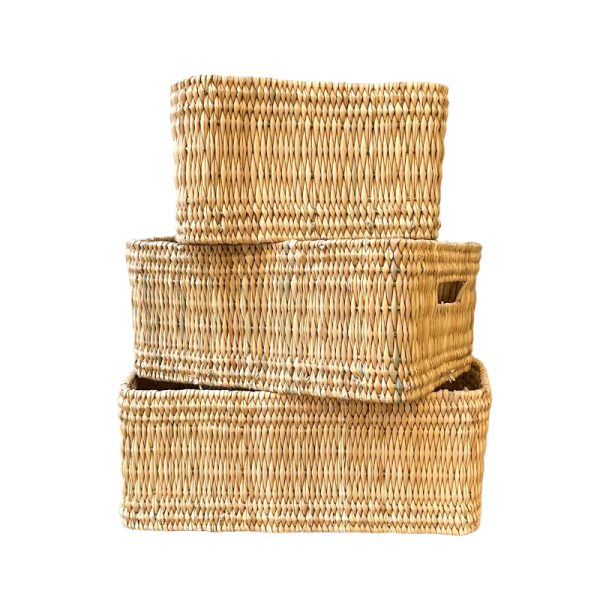 Set de tres Cestos de Junco, rectangulares de tono claro, perfectos como base para crear cestas gourmet o de desayuno llenas de encanto. Su diseño natural y resistente también los convierte en una solución ideal para organizar cualquier espacio. Disponible en 3 tamaños S, M y L.