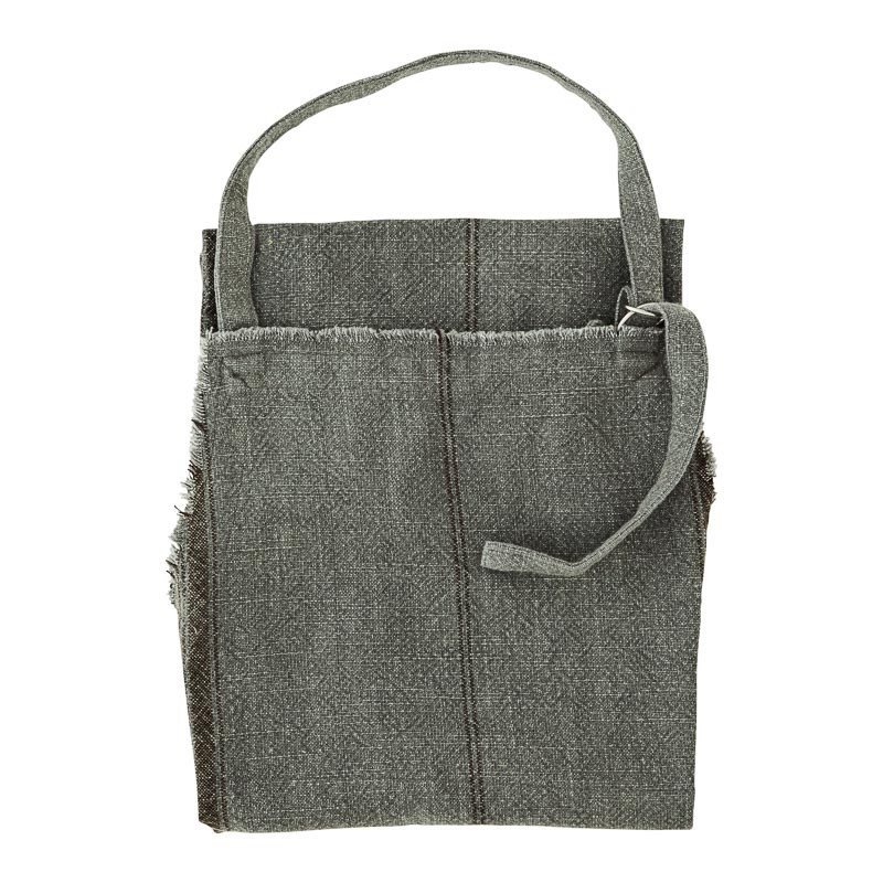 Precioso delantal a rayas en color gris y negro con bordes deshilachados. Realizado en algodón puro de gran calidad. Disponible también en color mostaza.