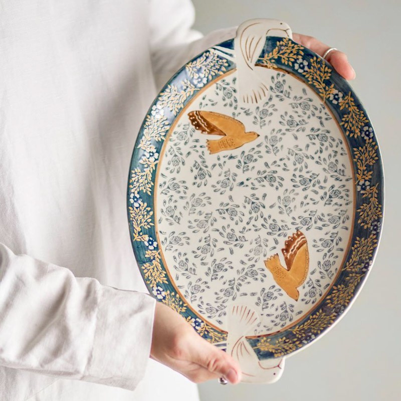 La Bandeja Hezha de Bloomingville es una hermosa bandeja de servir decorada a mano que impresiona por sus intrincados detalles. Presenta un diseño grabado combinado con un encantador patrón impreso de pájaros en tonos cálidos. Es perfecta para servir o como elemento decorativo en el hogar.