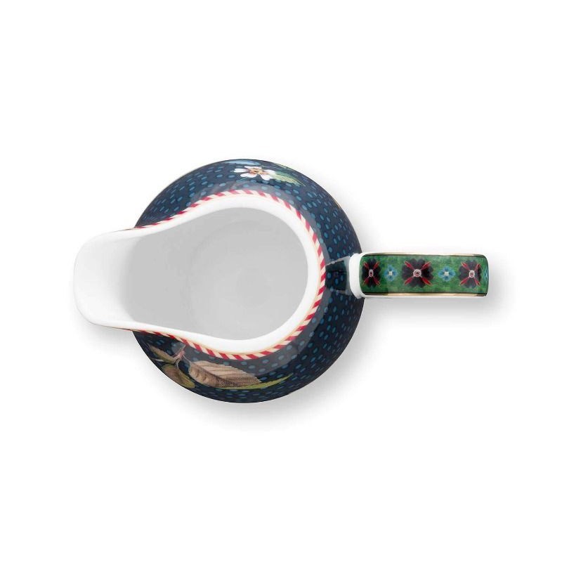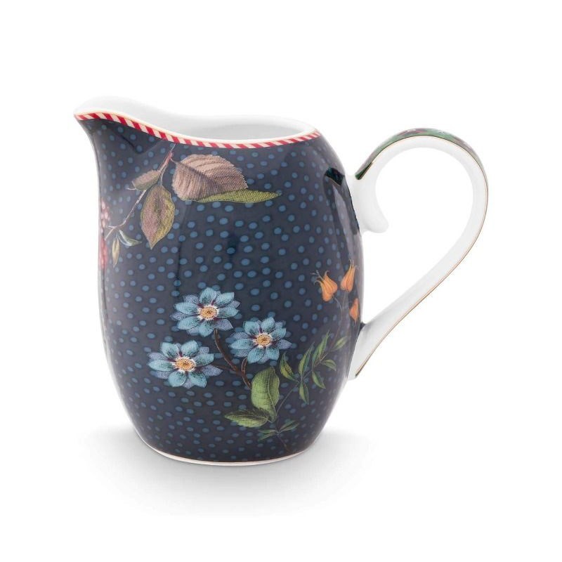 Lechera Berry Blues Blue de colores azul y verde oscuros que otorgan a la jarra un aspecto muy cálido y elegante. Está decorada con un diseño floral azul oscuro con ramas de las que brotan flores y bayas de fantasía. Los bordes están acabados con detalles en dorado y una sorprendente franja roja y blanca, lo que le otorga a la Jarra Berry Blues un toque extra cálido y acogedor.