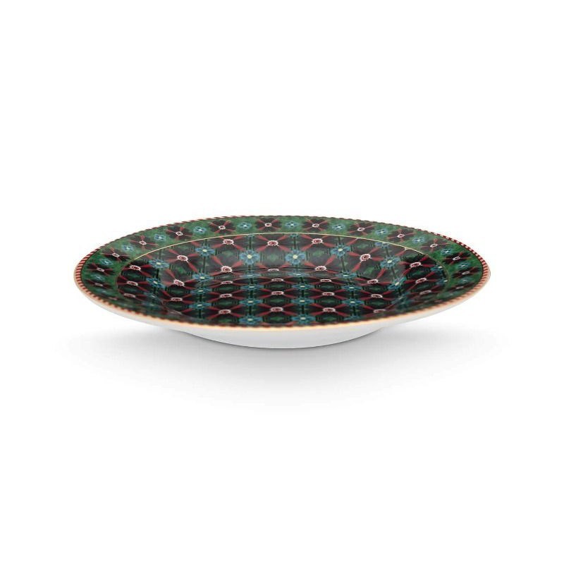 Este pequeño Plato Clover Green 12 cm está decorado con un patrón de azulejos verde intenso con acentos rojos, que recuerdan a los clásicos cuadros invernales. Los bordes están acabados con detalles en dorado y una sorprendente franja roja y blanca, lo que le otorga al Petit Four Clover un toque extra cálido y acogedor.