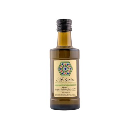 Aceite de Oliva Virgen Extra Al-balâta, Aove ecológico morisca monovarital obtenida solamente con procedimientos mecánicos. Esta variedad autóctona de Extremadura presenta un frutado medio con notas vegetales a hierba y a tomatera. Amargo y picante en intensidad media. Muy adecuado para ensaladas, gazpachos, carnes y pescados.