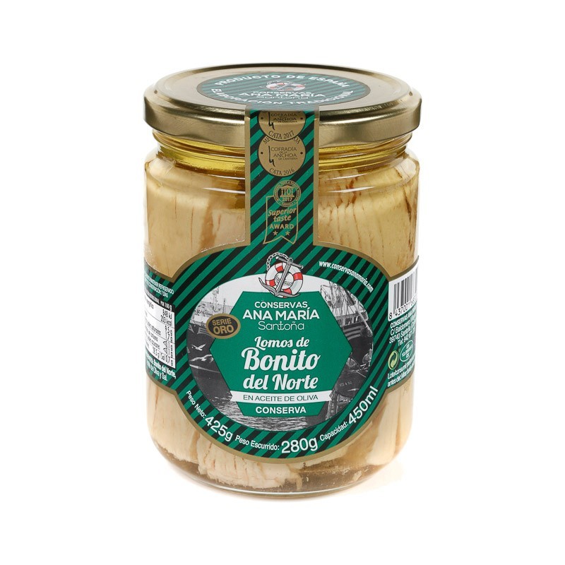 Tarro de cristal de Lomos de Bonito del Norte Conservas Ana María, bonito costero en aceite de oliva.