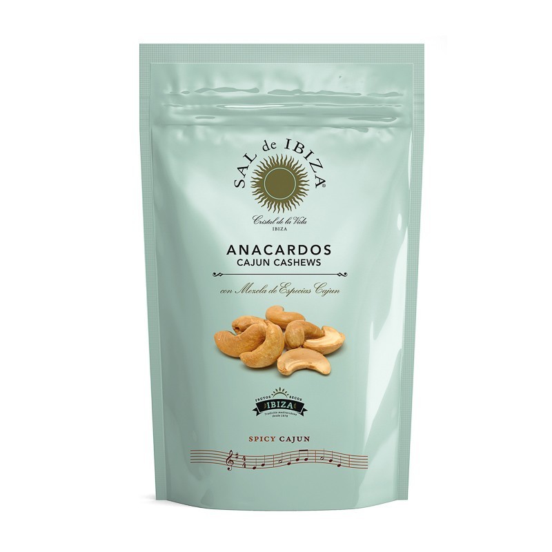 Deliciosos Anacardos Spicy Cajun Sal de Ibiza, anacardos fritos y marinados con sal de Ibiza y una exótica mezcla de especias (ajo, pimentón, cebolla, pimienta, comino, orégano, cardamomo, tomillo y mejorana). Sabor único para tus aperitivos.