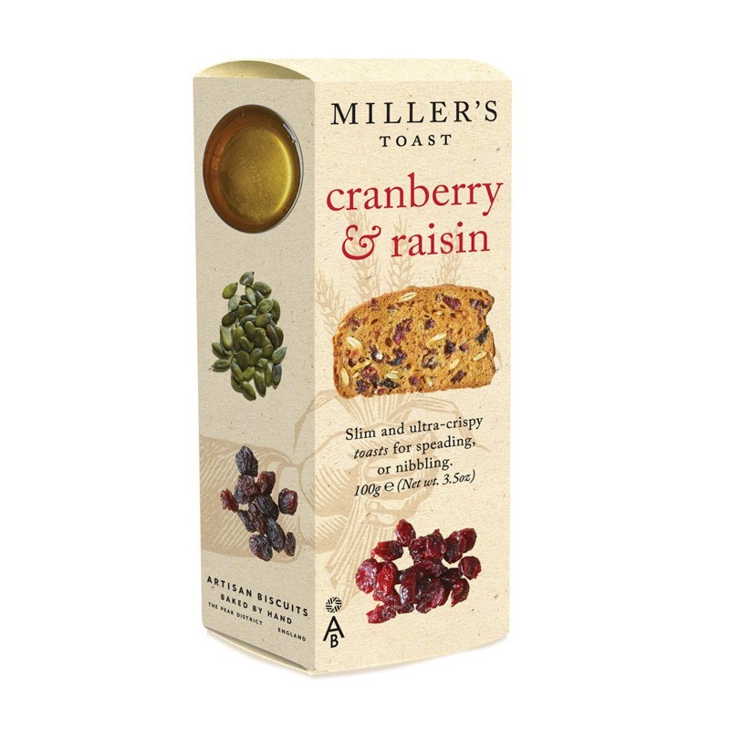 Tostas Miller de arándanos y pasas, finas y crujientes con arándanos, pasas, miel y aceite de oliva virgen. Combina con tus quesos y patés favoritos.