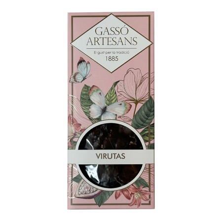 Virutas finas de galleta bañadas en chocolate negro Gassó Artesans. Un bocado crujiente y sofisticado con sabor intenso.